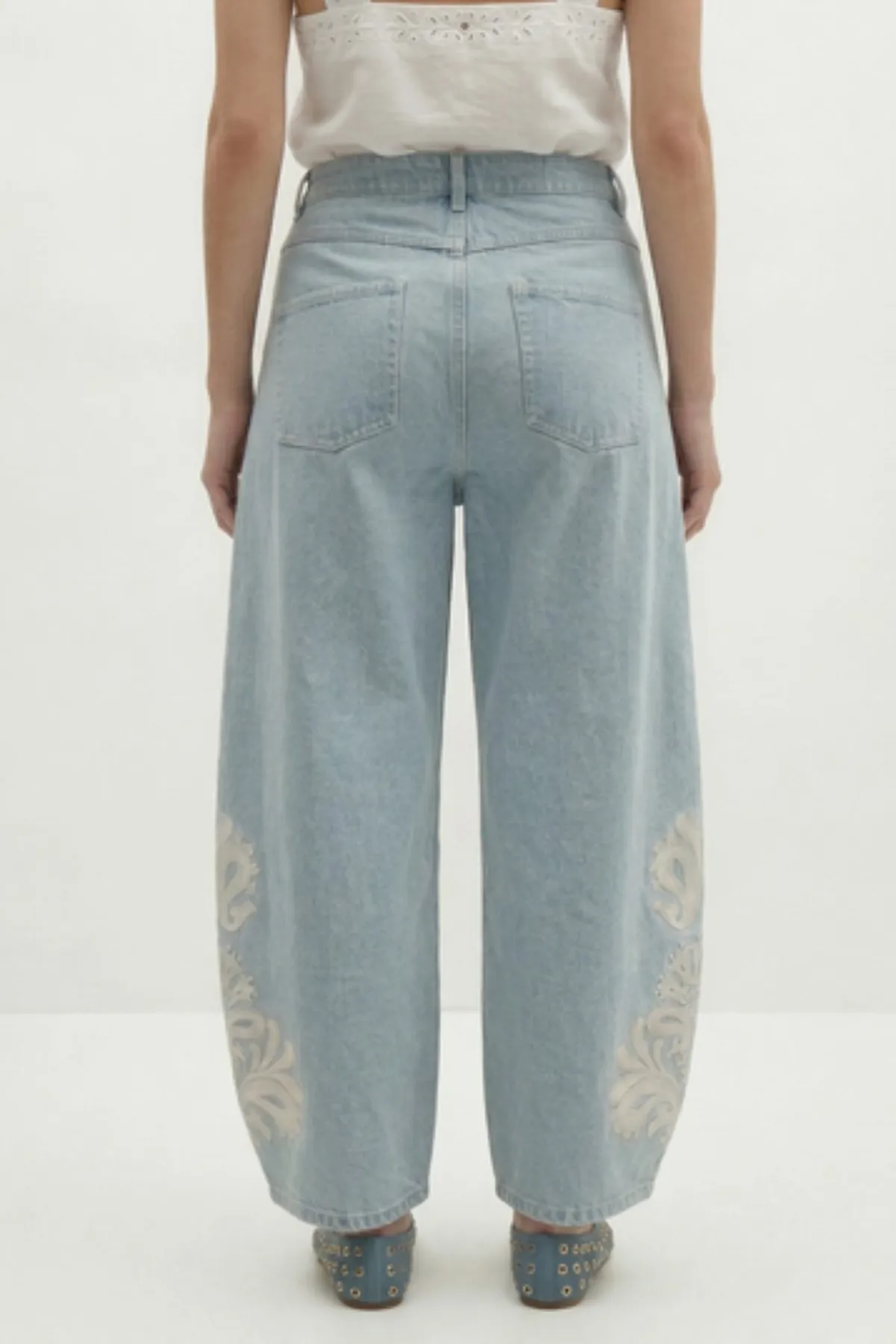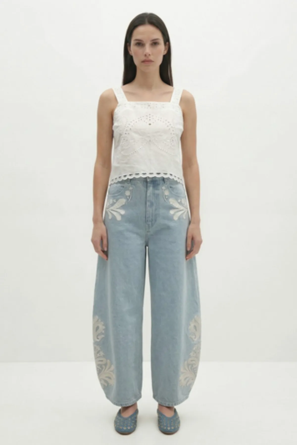 Des broderies délicates qui viennent sublimer le denim pour apporter une touche artisanale et féminine à cette pièce de caractère.